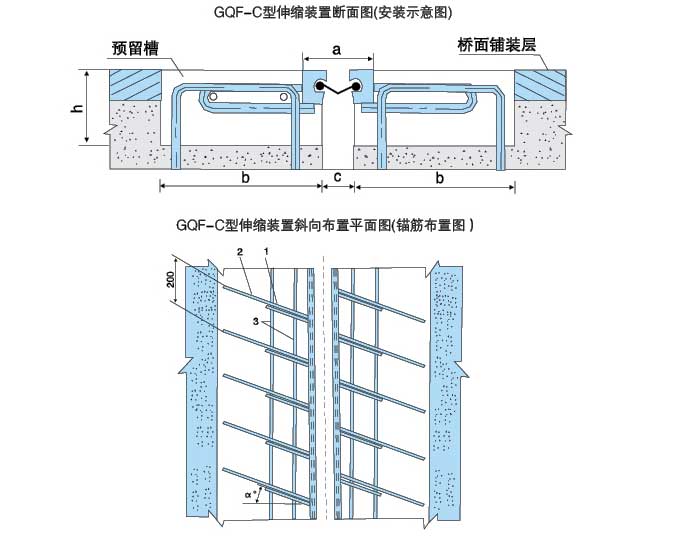 圖中:h、b分別為預留槽深度與寬度,a為錨固筋與邊梁之間的角度,用戶可根據(jù)橋梁實際預留槽尺寸 選擇GQF~C、GQF-F. GQF-E. GQF—Z. GQF~L中所列任一種,如用戶有特殊要求,可向我公司提 供具體圖紙,我公司將為您另行設計。