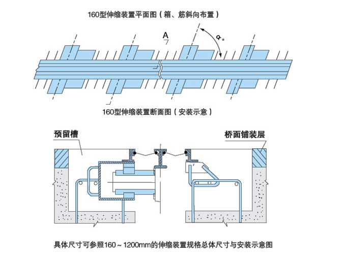 為適應河流方向與行車路線不垂直的橋梁需要,可將錨固鋼筋和位移控制箱斜向布置,即將伸縮量為0~ 80mm的各種伸縮裝置及I60~1200mm的模數(shù)式伸縮裝置的錨固鋼筋及位移控制箱水平傾斜的焊在異型邊梁 上,其錨固鋼筋與邊梁的交角隨橋梁的傾斜方向與傾斜程度而改變。