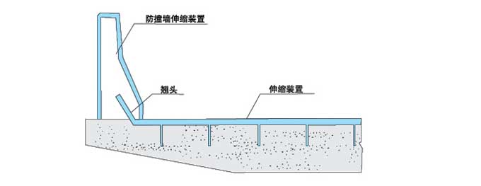 為了防止橡膠密封袋內(nèi)的積水流向墩臺,可在伸縮裝置兩端設置翹頭,伸縮裝置的翹頭可根據(jù)不同的路面設計不同的樣式(翹起來長度及角度),翹頭一般置于防撞墻內(nèi)部。如下圖所示:
